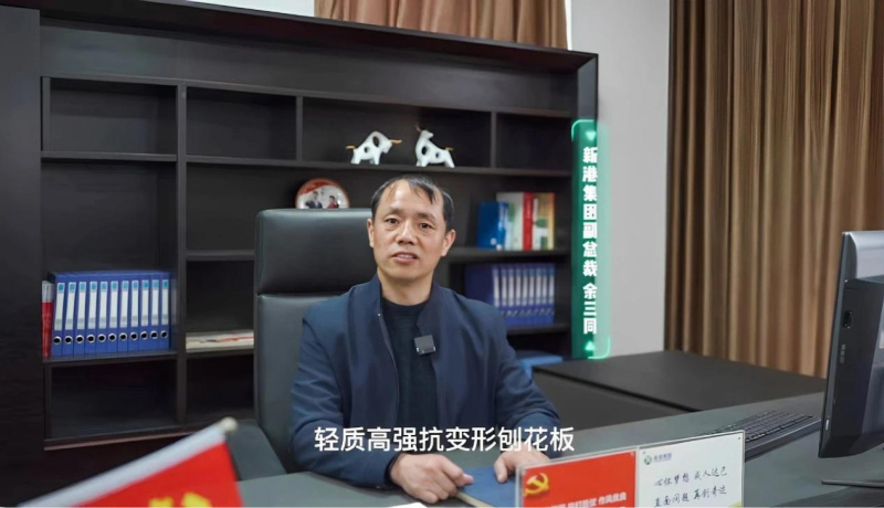 新港集團向聯(lián)盟成員介紹集團概況、主營產(chǎn)品及科技創(chuàng)新等相關情況。當前世界木材資源短缺的問題日益突出,而且下游的定制家居企業(yè)越來越重視視覺一體化,對于輕質高強大幅面刨花板產(chǎn)品的需求日益增長。在此背景下,新港集團使用仿生無醛膠黏劑,通過精準控制大片刨花制備、大片刨花均勻鋪裝實現(xiàn)無醛輕質、高強刨花板的規(guī)模化生產(chǎn),并成功應用于超高柜門等領域,解決了超高柜門在使用過程中的變形問題,節(jié)省了拉直器。同時,確保正反面飾面材料應力一致,避免由于正反面飾面材料不一致造成柜門變形的質量問題。密度在590~630g/cm3范圍內(nèi),靜曲強度達到18MPa,甲醛釋放量達到ENF級,抗變形能力強,能夠滿足“一門到頂”的需求。